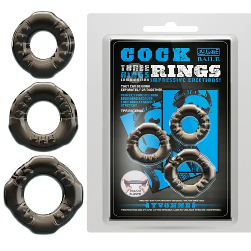 CockRings Yvonne Three Set from Baile Pretty Love includes three soft, stretchy TPR rings in assorted sizes. Designed to encase penis and testicles, these waterproof rings enhance erection strength, prolong stamina, and intensify pleasure for extended intimate sessions.