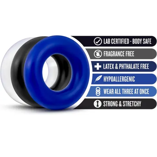 StayHard ~ Donut Rings, Perform like the stud you are! These Stay Hard Rings are a simple, seductive way to feel harder, bigger and prolong your play! Stay Hard cock rings provide amazing benefits as these can be used around the shaft or both the shaft and testicles to increase both your size and stamina. This trio of cock rings are also made of super stretchy elastomer. Easy to clean and good to go again and again– just like you!